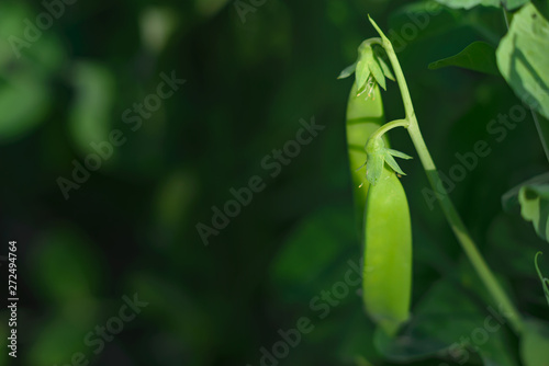 © Maryana, Naklejka premium Beautiful green peas on the background of a blurred Bush