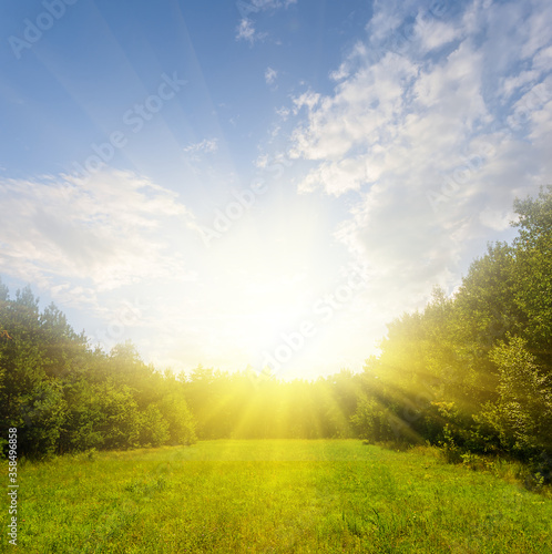 © Yuriy Kulik, Obraz premium beautiful green summer forest glade in a light of sparkle sun