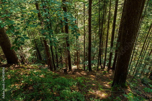 Naklejka premium Beautiful green summer forest in the mountains after the rain