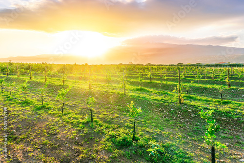 Naklejka premium beautiful green sunset garden with rows of young fruit trees in agricutlure farm field during sunset with amazing cloudy sky on background