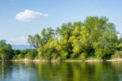 Fototapeta premium Beautiful green trees on the river shore reflecting in the water with blue sky and white clouds