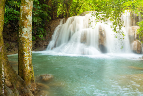 Fototapeta premium Beautiful green water and wonderful waterfall at the jungle, Erawan's waterfall