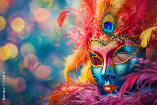 © Olegarx525, Fototapeta premium Beautiful greeting card with bright holiday composition for happy celebrate mardi gras
