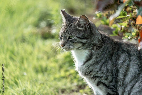 Fototapeta premium Beautiful grey cat with tripes chilling in the sun in a green and fresh garden
