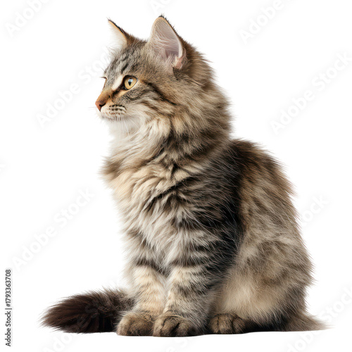 © Tanveer, Naklejka premium Beautiful grey fluffy Maine Coon cat sitting isolated on white background