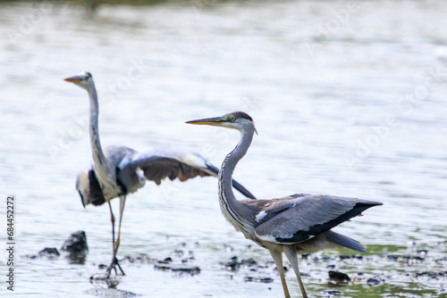 © d3_plus, Fototapeta premium 喧嘩する美しいアオサギ(サギ科)。日本国東京都江戸川区、葛西臨海公園にて。 2023年8月14日撮影。Beautiful Grey Heron (Egret family) in fighting.At Kasairinkai park, Edogawa-ku, Tokyo, Japan, photo by August 14, 2023.