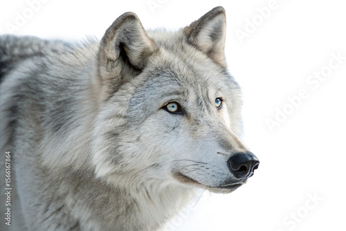 © Faizan, Fototapeta premium Beautiful grey wolf showcasing its unique dual-colored eyes, blue and yellow, in a serene, high-key setting