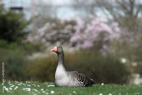 © nic, Fototapeta premium Beautiful Greylag goose lying on a pretty lawn full of daisies in spring in the Parc de la Tête d'or with flowers in the background