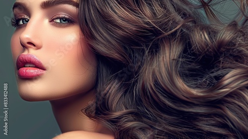 Obraz premium Beautiful hair long curly hairstyle woman with beauty makeup female model portrait. copy space for text.