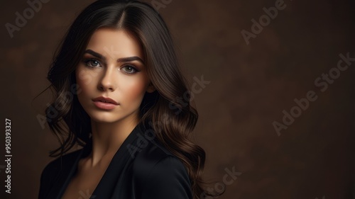 Fototapeta premium Beautiful hair woman black dress hairstyle female. Color background. Brown
