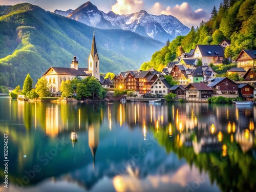 Naklejka premium Beautiful Halstat Village Reflected in the Serene Waters of the Lake Amidst...