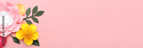 Naklejka premium Beautiful handmade paper flowers on pink background with space for text