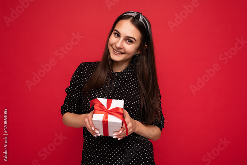 © Ivan Traimak, Fototapeta premium Beautiful happy brunette girl isolated over colourful background wall wearing stylish casual clothes holding gift box and looking at camera
