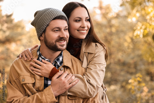 Fototapeta premium Beautiful happy couple hugging outdoors on autumn day