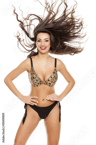 © vladimirfloyd, Fototapeta premium Beautiful happy fashion model in black bikini on white background