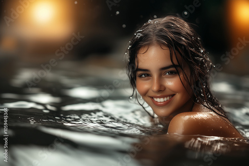 © Dmitriy, Fototapeta premium Beautiful happy girl swimming in the sea background..