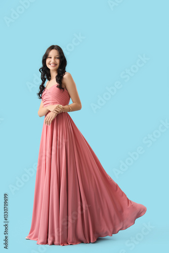 Fototapeta premium Beautiful happy teenage girl in stylish pink prom dress on blue background
