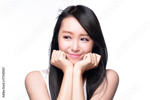 © ryanking999, Fototapeta premium Beautiful happy woman look copyspace