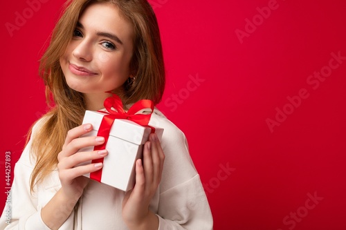 © Ivan Traimak, Fototapeta premium Beautiful happy young blonde woman isolated over colourful background wall wearing stylish casual clothes holding gift box and looking at camera