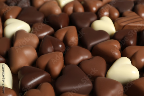 Fototapeta premium Beautiful heart shaped chocolate candies as background, closeup