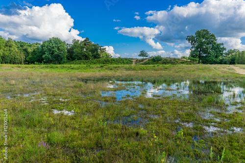 Fototapeta premium beautiful heather forest landscape with huge reflecting water puddle