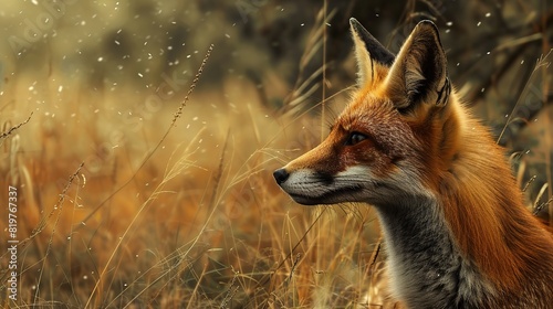 © Kashem, Naklejka premium Beautiful High angle shot of a cute fox lying on the ground in the forest surrounded by greenery