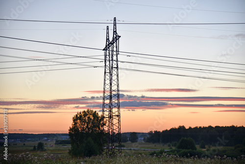 © Lushchikov Valeriy, Fototapeta premium Beautiful high-voltage iron transmission line in the evening in the sunset sky. Landscape evening and wires and power lines.