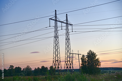 © Lushchikov Valeriy, Fototapeta premium Beautiful high-voltage iron transmission line in the evening in the sunset sky. Landscape evening and wires and power lines.