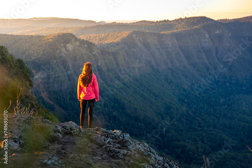 © Jakub, Obraz premium beautiful hiker girl enjoying sunset over unique, folded mountains in south east queensland, australia; main range national park near brisbane, bare rock lookout