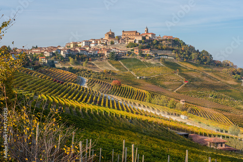 Naklejka premium Beautiful hills and vineyards during fall season surrounding La Morra...