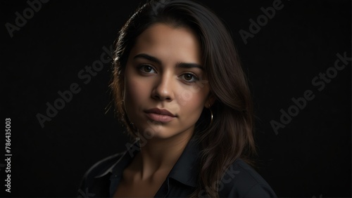 © Arceli, Fototapeta premium beautiful hispanic woman looking at camera serious on dark plain black background from Generative AI