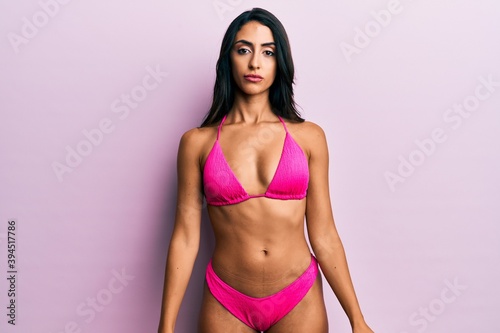 Obraz premium Beautiful hispanic woman wearing bikini with serious expression on face....