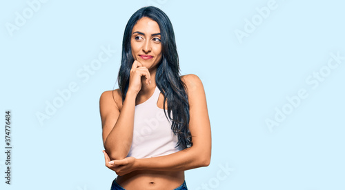 © Krakenimages.com, Fototapeta premium Beautiful hispanic woman wearing casual clothes with hand on chin thinking about question, pensive expression. smiling and thoughtful face. doubt concept.