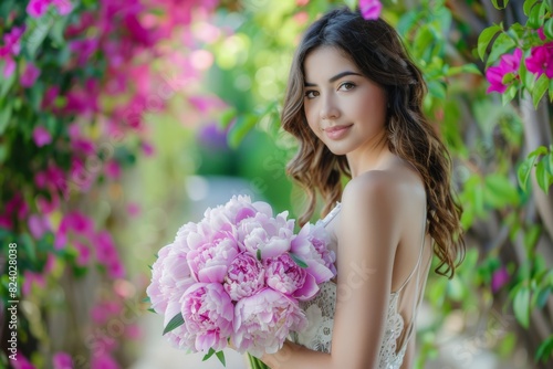 © Dina, Fototapeta premium beautiful hispanic woman with pink peonies bouquet in the park on vacation near bougainvillea in bloom