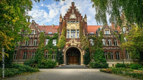 © Kitta Studio, Naklejka premium Beautiful Historic Building with Greenery and Blue Sky Background