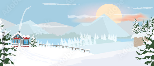 © zeynurbabayev, Fototapeta premium Beautiful horizontal Winter Landscape with mountain fir tree and bare tree with snow. Flat and solid color vector illustration.