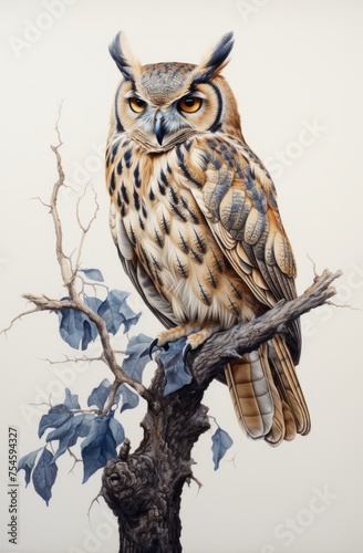 © ART IMAGE DOWNLOADS, Obraz premium Beautiful horned owl sitting on a big tree on a white background, looking for food. lovely feather markings.
