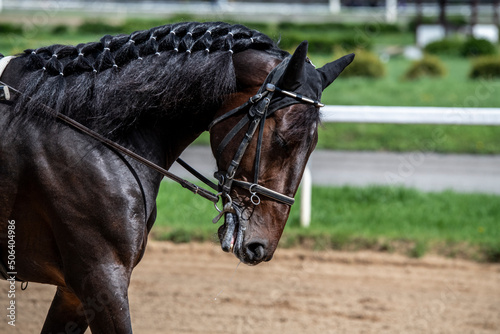 Obraz premium beautiful horse of black suit close-up on the hippodrome
