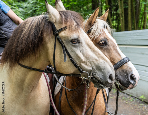 © константин константи, Fototapeta premium beautiful horses close up in the green forest on a sunny summer day