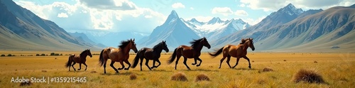 Fototapeta premium Beautiful horses galloping freely across lush valley with Andes mountains in...