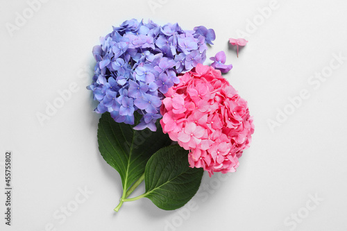 © New Africa, Obraz premium Beautiful hortensia flowers on light background, flat lay