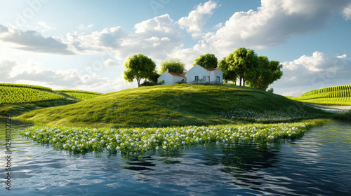 © Mahmud, Obraz premium Beautiful House on a Floating Island Surrounded by Lush Greenery and Water