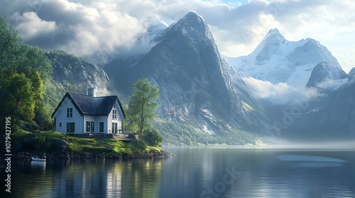 © Bijali, Fototapeta premium Beautiful house water with majestic mountains image