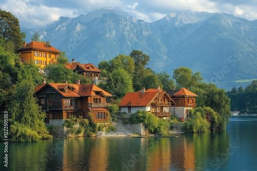 © EdvvinStudios, Naklejka premium Beautiful houses reflecting on a lake with majestic mountains in the background
