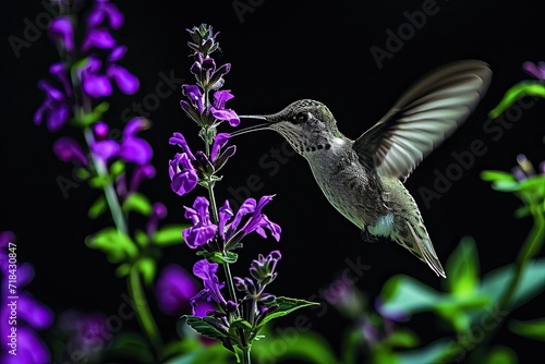 Fototapeta premium Beautiful Hummingbird flying finding Salvia nectar flowers isolated on black background AI Generative