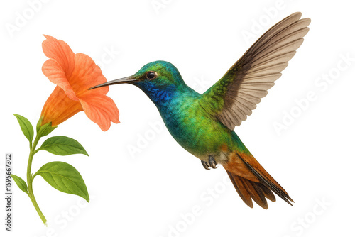 Fototapeta premium Beautiful hummingbird with iridescent colorful feathers flying near an orange flower with transparent background