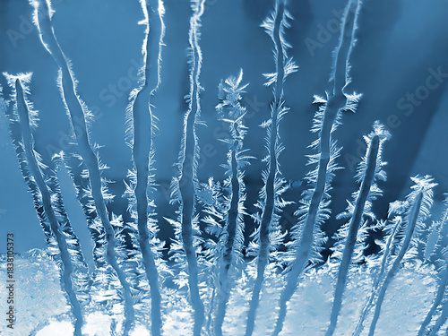 © Dinadesign, Fototapeta premium Beautiful ice pattern on window glass, close-up natural winter background