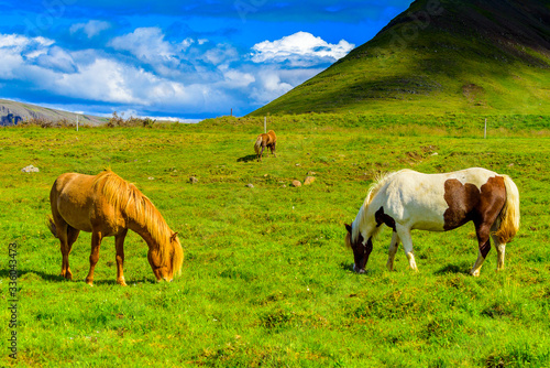 © Jim, Obraz premium Beautiful Icelandic horses grazing