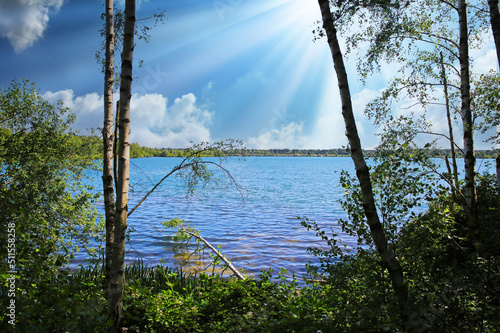 © Ralf, Obraz premium Beautiful idyllic dutch morning lake scenery landscape, forest trees, sun rays - Maasduinen NP, Netherlands