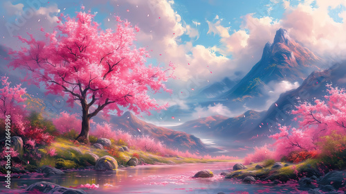 © Cobalt, Obraz premium Beautiful idyllic view, oil painting of trees covered with flowers with mountains in the background.